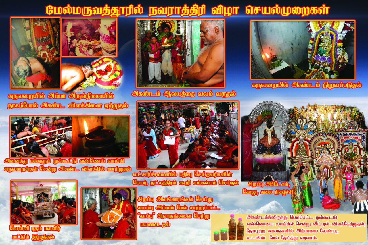 Navarathri is a key festival celebrated over nine days. On the first day, Amma lights the lamp called Agandam filled with three oils -Neem, Coconut and Sesame. Prior to lighting the lamp, Amma goes around the Siddhar Peedam thrice, then enters PuttruMandapam to worship the Goddess, during which time Adhiparaksathi transcends into him.